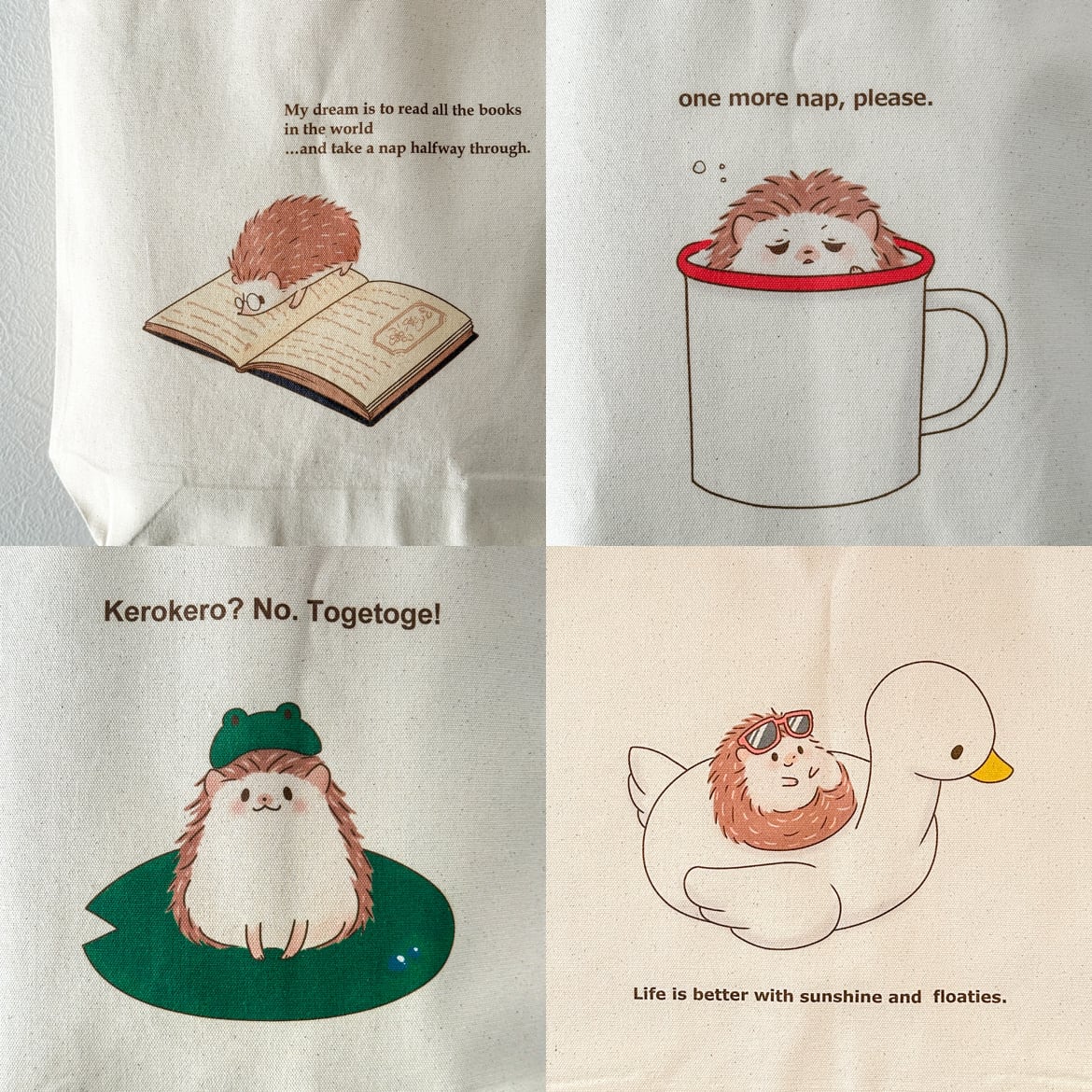 あひるの浮き輪に乗って、のんびりバカンスを楽しむハリネズミのイラストを描いたキャンバストートバッグです。